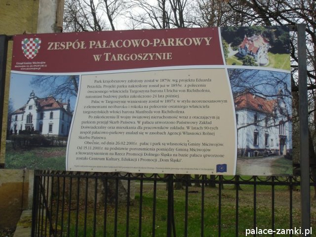 Znacznie starszy od pałacu jest znajdujący się w miejscowości kościół p.w. św. Jadwigi o formach późnego gotyku. Pałac w Targoszynie powstał w 1897 r. w neobarokowym stylu z elementami neorenesansu i rokoka. Fundatorem rezydencji był ostatni właściciel targoszyńskiego majątku baron Manfred von Richthofen. Założenie posiada dwie kondygnacje i kryte jest dachem spadowym łamanym. Jest murowane i powstało na planie zbliżonym do czworoboku. Budynek pałacu umieszczony został w przemyślnym założeniu parkowym i odgrodzony kamiennym murem od zabudowań folwarcznych. Całość zabudowań wraz z parkiem nosi nazwę Zespołu Pałacowo-Parkowego. Dookoła pałacu roztacza się wielki i piękny park którego pierwsze plany były nakreślone już w 1855 r. Inicjatorem przedsięwzięcia był ówczesny właściciel Targoszyna baron Ulrich von Richthofen. Ostateczny swój charakter park uzyskał w 1879 r. dzięki projektom Eduarda Petzolda. Koło pałacu znajduje się pomnik ku czci XXV - lecia PRL-u.Po II wojnie światowej pałac wraz z przyległościami przejął Skarb Państwa i stworzył w nim Państwowy Zakład Doświadczalny wraz z mieszkaniami dla pracowników. Wraz z upadkiem komunizmu pałac przeszedł pod zarząd Agencji Własności Rolnej Skarbu Państwa. W 2001 r. został przejęty przez Gminę Mściwojów. Dzięki niej oraz Stowarzyszeniu na Rzecz Promocji Dolnego Śląska zabytek został odrestaurowany, a wewnątrz stworzono Centrum Kultury, Edukacji i Promocji "Dom Śląski". Jednak teraz zabytek powoli popada w ruinę.