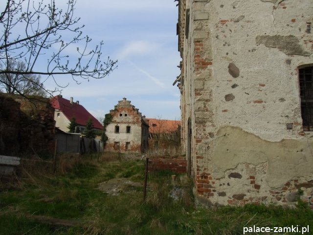 W stanie obecnym jest założeniem, wzniesionym na planie prostokąta z niewielkim dziedzińcem i dobudowaną oficyną, dwukondygnacyjny, trzytraktowy. Cały obiekt jest nakryty, znacznie zniszczonymi dziś, dachami ceramicznymi. Budynek znajduje się w stanie postępującej ruiny. W niektórych pomieszczeniach zachowały się jedynie fragmenty oryginalnego belkowania i stropy kolebkowo- krzyżowe. Ciekawie prezentują się renesansowe, kamienne obramowania okien oraz renesansowe i barokowe portale wejściowe. Obecnie zachowała się już tylko niewielka część dachu i 8 z 11 renesansowych szczytów. Dewastacja objęła także zabudowania gospodarcze pochodzące z XIX wieku: stajnie i obory. Za dworem rozciąga się zdewastowany dziś park.