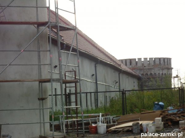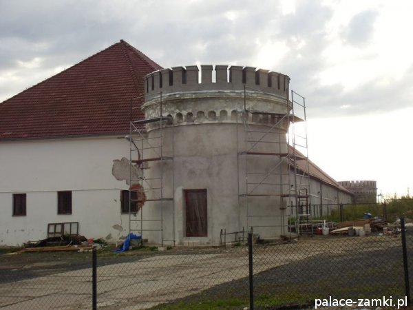 Pałacowi towarzyszą zabudowania gospodarcze wzniesione w tym samym co on czasie. Tworzą one czworobok dwukondygnacyjnych budynków otoczonych murem. W jego narożach wznoszą się cztery okrągłe wieże o stożkowych dachach. Wygląda to jak zespół muru obronnego z wieżami przy dawnych zamkach.
