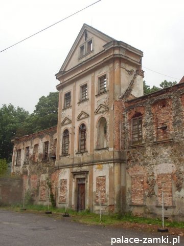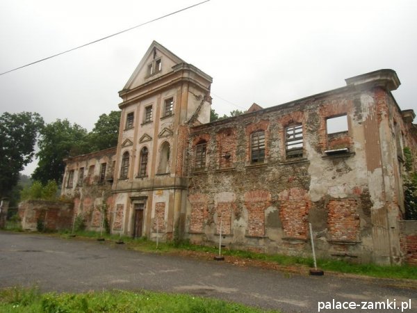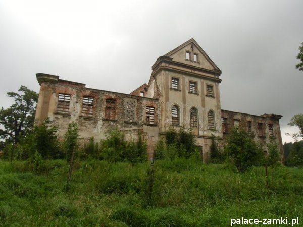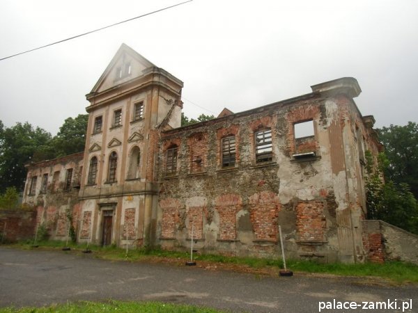 Ruina pałacu to dwukondygnacyjny budynek, częściowo podpiwniczony, wzniesiony na planie wydłużonego prostokąta o nieznacznie zaokrąglonych narożach. Frontowa i ogrodowa elewacja są 13-osiowe, które zaakcentowane zostały 3-kondygnacyjnymi, 3-osiowymi ryzalitami i zwieńczone naczółkami. Okna mają proste obramienia, jedynie w drugiej kondygnacji ryzalitów zostały zwieńczone arkadą. Elewacje boczne są 5-osiowe. Wewnątrz pałacu układ pomieszczeń jest korytarzowy z obszerną sienią pośrodku, wspartą na toskańskich kolumnach.