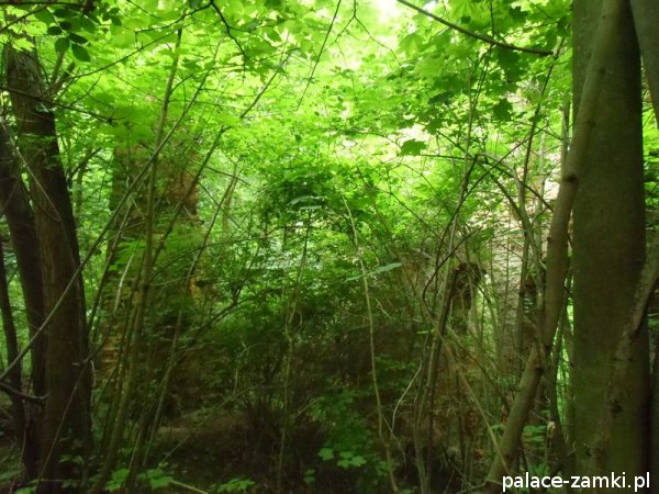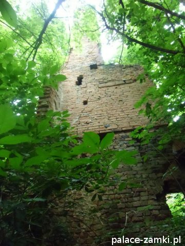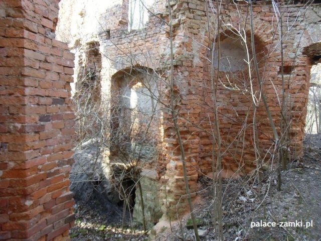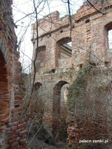 Wysiadając z samochodu trafiliśmy na wielką ścianę dzikiej roślinności. Można powiedzieć, że dzięki zimowej porze roku znaleźliśmy te ruiny. Od strony drogi zza krzaków wyłoniła się zmasakrowana bryła, która jest cieniem dawnego pałacu – widok nie zachwycał, zwykły dom mieszkalny z fosą. Zaczęliśmy szukać wejścia na drugą stronę. Przedzieraliśmy się przez wielkie krzaki, a jak się później okazało, można było wejść innym wejściem- dróżkę tą zasłaniały drzewa i do wybrania jej zniechęcała błotnista polana, przez którą owa dróżka wiodła.