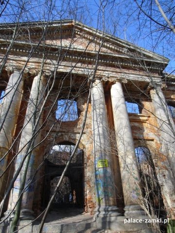 Gdy już dotarliśmy na drugą stronę pałacu, jak się okazało frontową, widok zaparł nam dech w piersiach. Wielki i wspaniały, który ocalał do czasów obecnych, portyk 6 kolumnowy, który świadczy o świetności niegdyś tego ogromnego pałacu. Wygląda to jak rodem z architektury Greckiej.