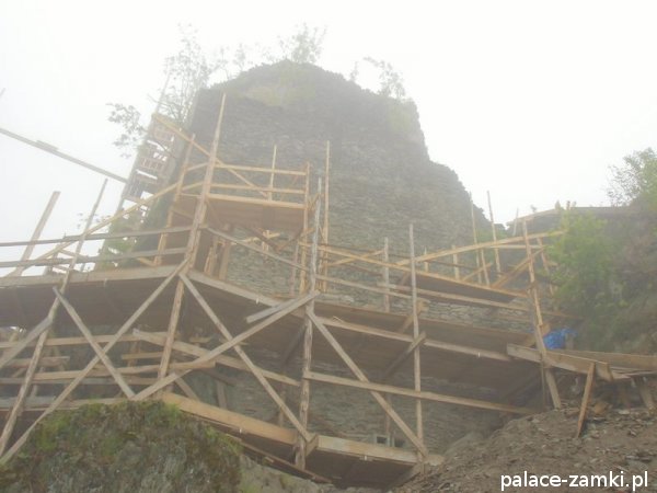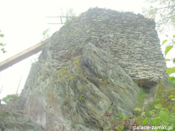 Pierwszym udokumentowanym właścicielem lub dzierżawcą był w latach 1300-1339 kasztelan Albert Bawarczyk z Waltersdorfu. Z tego okresu pochodzi ośmioboczna, czterokondygnacyjna wieża z charakterystycznym ostrzem skierowanym na wschód gdzie zbocze opada łagodniej. Posiadała ona dwa piętra które wykorzystywane były także do celów mieszkalnych oraz dwa poziomy piwnic częściowo wykute w skale. Od wschodu do wieży przylegało trzykondygnacyjne założenie mieszkalne na planie litery L. Składało się z dwóch skrzydeł: południowego o wymiarach 4,5 do 6,5 m x 15 m. oraz północnego o wymiarach 3 do 5m x 17 m. W obu skrzydłach znajdowały się po dwa pomieszczenia z tym, że w części północnej znacznie większe– tam też prawdopodobnie mieściła się reprezentacyjna sala rycerska. Nie jest znane pierwotne położenie kaplicy zamkowej– stąd przypuszczenie iż znajdowała się w wykuszu ściany południowej. Od strony zachodniej wieża dodatkowo otoczona była kamiennym murem. Tu umieszczono wejście na wąskie międzymurze i do piwnicy. Tak zaplanowane założenie obronne stanowiło niedostępny a zarazem doskonały punkt obronny na pograniczu śląsko-czeskim.
