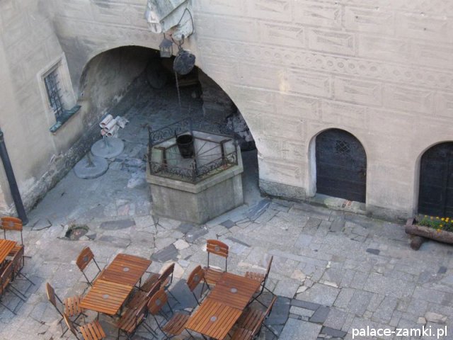 Na dziedzińcu wewnętrznym ciekawostką jest studnia wydrążona w skale zwana studnią „niewiernych żon”. Jest to tajemnicza studnia, która zasłynęła dzięki okrutnej tradycji rodu Nostitzów– jeśli pan rodu wracał z wypraw do zamku, a zastał żonę z dzieckiem z nieprawego łoża– wrzucał żonę do zamkowej studni.