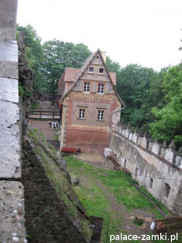 Przy wejściu do zamku wita nas Brama Lwów i ornamenty z XVI wieku, wykonane rzadką metodą malarską, zwaną sgraffito. Zamek zbudowany z kamienia na planie nieregularnym, można powiedzieć, że jest dopasowany do kształtu szczytu góry. Składa się on z dwóch części- zamku górnego i dolnego z budynkami gospodarczymi.
