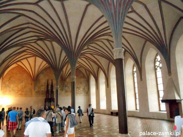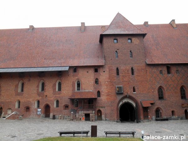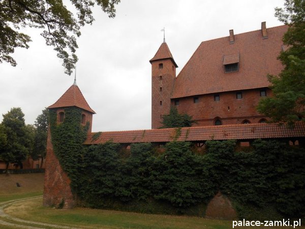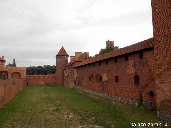 Zamek Średni, wzniesiony w miejscu byłego przedzamcza, trójboczny, z rozległym dziedzińcem otwartym ku Zamkowi Wysokiemu, który oddzielonym jest od niego murem i fosą, z kaplicą świętego Bartłomieja, Wielką Komturią, Infirmerią, Wielkim Refektarzem, Pałacem Wielkich Mistrzów, Refektarzem Letnim, Refektarzem Zimowym, wieżą Kurzą Nogą